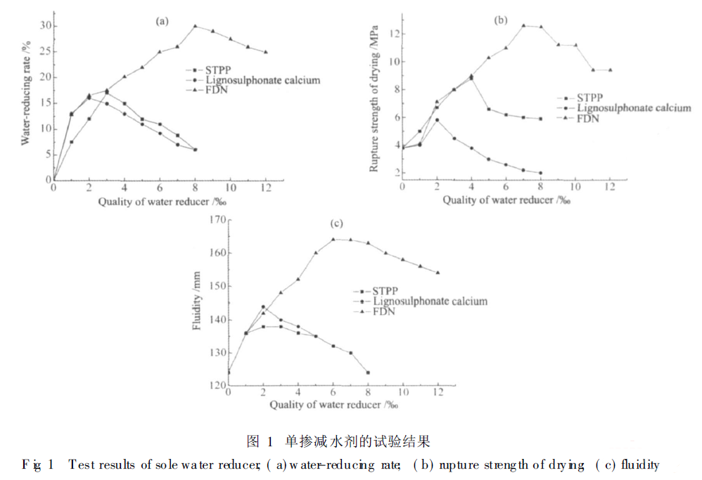 為了組成復合外加劑, 首先選擇了三聚磷酸鈉(徐州)、木鈣(廣州)和 FDN高效減水劑(焦作)作為考察對象, 進行了單因素適應性考察。