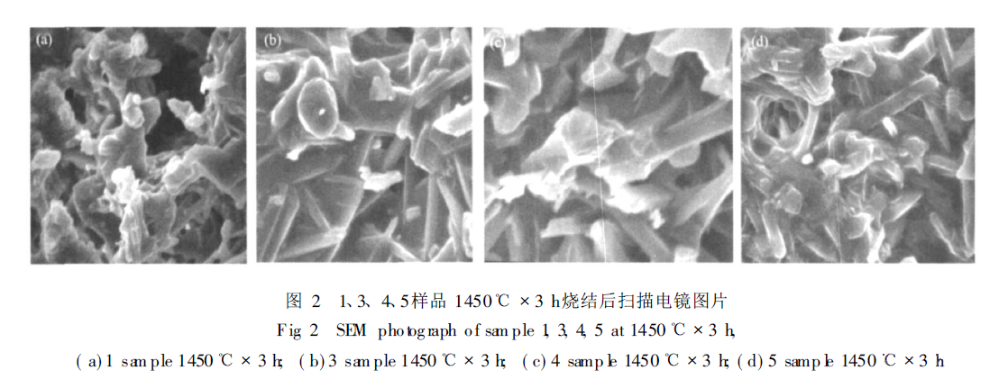 從表2中可以看出, 隨著復合減水劑的摻量增加, 相同加水量的澆注料的流動度逐漸增加, 當復合減水劑加入量到澆注料總量的15%時, 澆注料出現泌水現象; 1450℃x3h燒后的體積密度先增加然后逐漸下降, 而顯氣孔率則先降低然后增加, 抗折強度都是先增加后降低, 這是因為加入減水劑時先使澆注料的需水量降低, 從而成型后殘余水分降低, 提高其密實性, 使其性能得到提高; 當減水劑加入量超過一定范圍時, 澆注料出現泌水現象, 降低了密實性, 而使其各項性能降低。從表2中可以看到 3,4,5三組樣品的各項物理性能是比較理想的。選這三組的 1450℃x3h燒制的試樣做掃描電鏡分析和 1試樣1450℃x3h燒制的試樣掃描電鏡作對比,其結果見圖 2。由SEM 照片可以看到: 1試樣1450℃x3燒制后晶體很少, 樣品中出現大的孔洞, 結合不緊密; 3試樣1450℃x3h燒結后出現較多柱狀晶體、六方長柱狀、扁平狀晶體, 晶體之間交錯在一起, 結合緊密, 試樣燒后膨脹, 主要是在晶體中生成莫來石, 而使體積膨脹; 4試樣1450℃x3h 燒結后可見到大量晶體膠結在一起, 晶體邊界不是很清晰, 但還是能見到柱狀晶體, 結合緊密; 5試樣1450℃x3h燒結出現大量長柱狀、針狀、六方柱狀晶體, 同時有大量晶體膠結在一起, 結合緊密。出現這種情況的主要原因在于減水劑摻量增加、流動性好, 干燥后的氣孔小, 粉體間結合緊密, 所以高溫時反應比較充分。