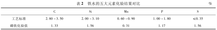 追根溯源,爐齡短是因為溫度高,溫度高是因為鐵水流動性差,因此對影響鐵水流動性的五大元素(C、Si、Mn、P、S)進行分析,其化驗結果見表2。由表2可知,能提高鐵水流動性的磷元素含量并不低,而能降低流動性的硫元素含量則超出標準4.5倍。