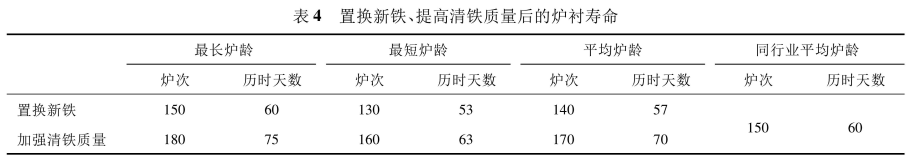 為了使更新的磷鐵成份保持長周期穩定,減少爐渣的產生,降低雜質對爐壁的腐蝕,也為了提高陽極澆鑄質量創造條件,在更新磷鐵后要堅持對回爐鐵進行清理后才能入爐熔煉。因為回爐鐵表面除了附著部分殘極碳粒,還有電解質,這些雜質對爐襯來說都是有害元素,其中碳粒和石英砂在高溫下發生還原反應(SiO2+2C=Si+2CO),而電解質作為堿性物對酸性爐襯同樣具有腐蝕作用,從而破壞爐襯影響爐齡。通過提高磷鐵清理質量,使爐齡在原有基礎上再次延長10~15天,爐次增加30次,見表4。