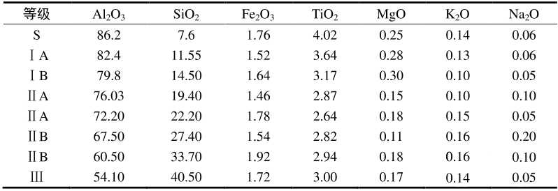 我國DK型高鋁礬土熟料按鋁含量的變化可分為五等,S等(Al2O3>85%):I等(Al2O3含量80~85%);IIA等(Al2O3含量70~80%);IIB等(Al2O3含量60~70%)和III等(Al2O3含量50~60%)。各等高鋁礬土燒后的化學組成如下表1所示。