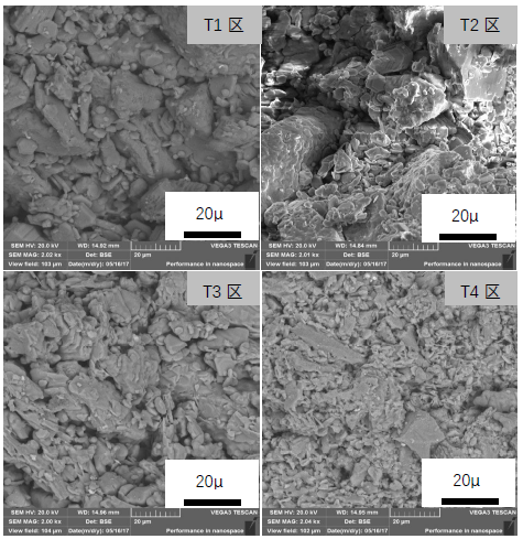 對比圖8中T4區圖及圖9中圖片也會發現,電極粉組抗渣侵蝕性能最差,在靠近外側區域已經有太多熔渣滲入。而球瀝青組和炭黑組在類似區域未見明顯熔渣滲透情況。