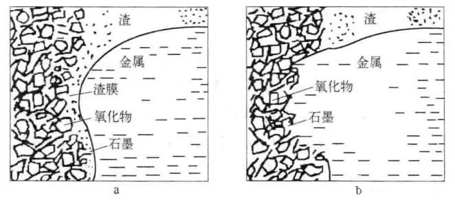 (1) 在渣膜運(yùn)動(dòng)中使碳懸浮。當(dāng)金屬中的碳濃度接近飽和區(qū)域中碳的濃度時(shí),隨著碳濃度的提高,局部熔損顯著減少,因而認(rèn)為可以通過(guò)增碳操作來(lái)抑制局部熔損。