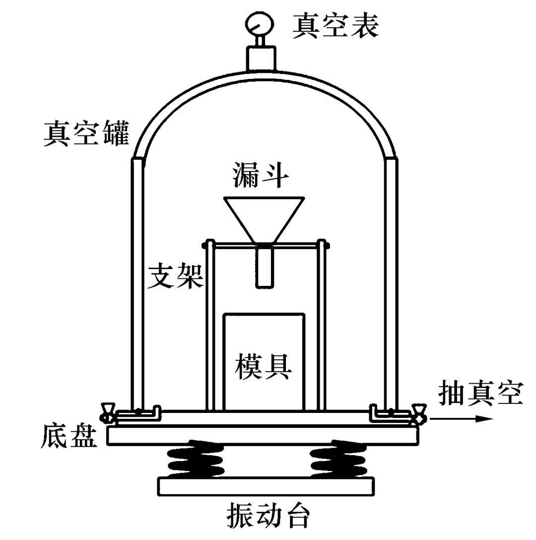 真空振動(dòng)澆注裝置示意圖見(jiàn)圖1。將混合漿料(加水量8%(w))放于裝置的漏斗中,抽真空至 -0.09MPa后保壓30min, 打開(kāi)振動(dòng)臺(tái)使其振動(dòng)頻率為60Hz, 待漿料完全流進(jìn)模具后再振動(dòng)1min, 停止振動(dòng)后放入空氣。機(jī)壓成型過(guò)程:將坯料(含水量8%(w))放入壓磚機(jī)模具內(nèi),在200MPa壓力下保壓90s。兩種工藝的坯體成型后均于100 ℃干燥72 h, 于1400 ℃氮化燒結(jié)8h。