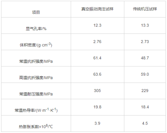 真空振動(dòng)澆注試樣和機(jī)壓試樣的常規(guī)性能測(cè)試結(jié)果見(jiàn)表2。真空振動(dòng)澆注成型過(guò)程中,其坯料相對(duì)于機(jī)壓成型的坯料分布更均勻,氣體排出充分,更有利于致密化,因此得到的試樣顯氣孔率相對(duì)較低,體積密度略高。同時(shí),真空振動(dòng)澆注試樣常溫抗折強(qiáng)度、高溫抗折強(qiáng)度和常溫耐壓強(qiáng)度與機(jī)壓試樣相比分別提高了26.0%、24.7%和33.2%,常溫?zé)釋?dǎo)率比機(jī)壓試樣高7.6%,而熱膨脹系數(shù)則比后者低13.3%。綜合來(lái)看,真空振動(dòng)澆注試樣的常規(guī)性能優(yōu)于機(jī)壓試樣的常規(guī)性能。