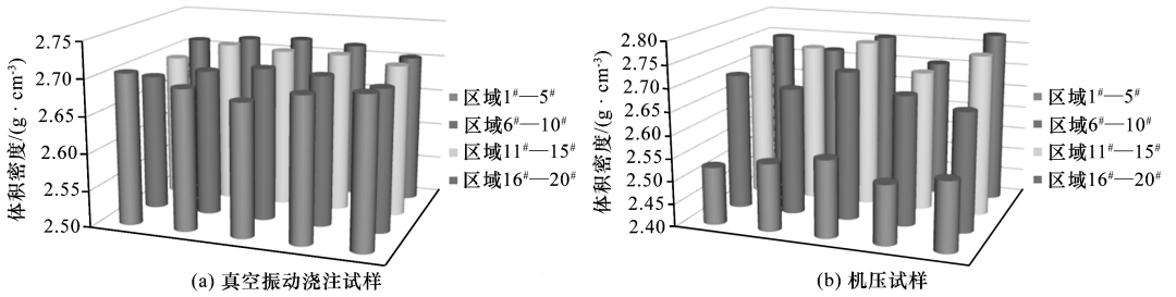 圖3 兩種試樣20個(gè)區(qū)域的體積密度分布