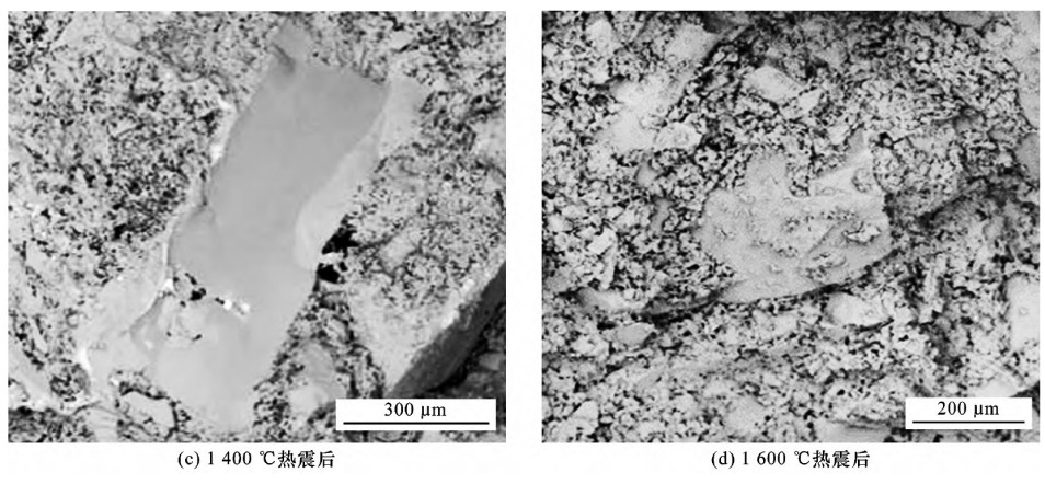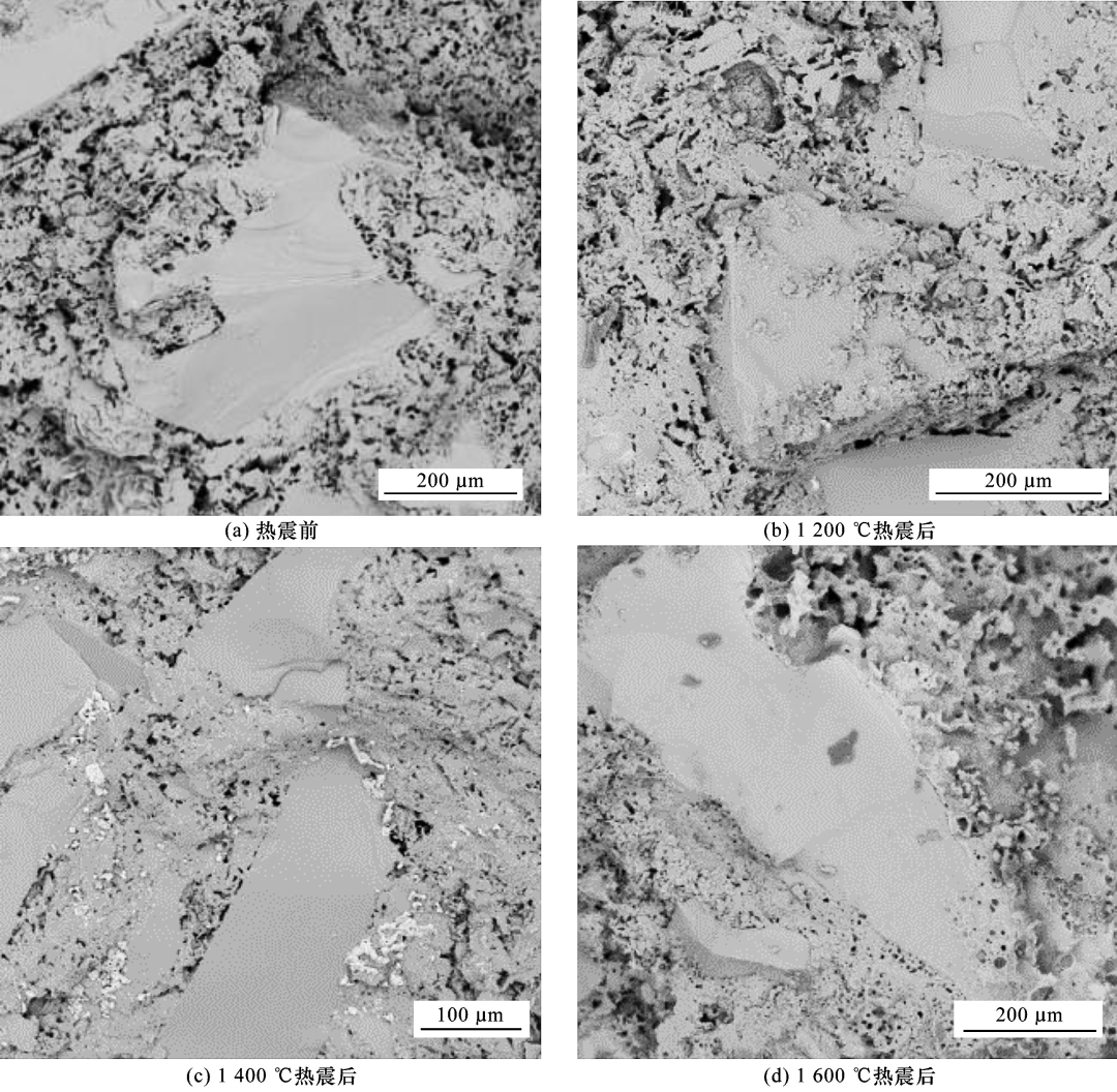 對(duì)于Si3N4-SiC耐火材料,SiC是增強(qiáng)相且質(zhì)量分?jǐn)?shù)(>70%)較大,Si3N4相主要起黏結(jié)作用。當(dāng)兩相界面結(jié)合強(qiáng)度足夠高時(shí),裂紋擴(kuò)展過(guò)程中SiC相以穿晶斷裂為主,消耗更多的斷裂能。熱震試驗(yàn)后,試樣界面受到氧化及熱應(yīng)力損傷,導(dǎo)致兩相結(jié)合強(qiáng)度下降,SiC相沿晶斷裂占比增大。裂紋在Si3N4相中擴(kuò)展所消耗的斷裂能較少,導(dǎo)致剩余斷裂韌性的降低。真空振動(dòng)澆注試樣熱震前后斷口處的微觀形貌見(jiàn)圖4。樣品斷口處玻璃相含量可反映試樣氧化的程度。由圖4可以看出:熱震溫度<1400 ℃時(shí),氧化痕跡不明顯;當(dāng)熱震溫度為1600 ℃時(shí),斷口表面有SiO2玻璃相析出,試樣氧化程度明顯增加。機(jī)壓試樣熱震前后斷口處的微觀形貌見(jiàn)圖5。由圖5可知,隨熱震溫度的升高,試樣氧化程度加深,機(jī)壓試樣在1600 ℃熱震后氧化腐蝕更嚴(yán)重,SiO2玻璃相已布滿(mǎn)斷口表面,說(shuō)明試樣內(nèi)部結(jié)構(gòu)已受到嚴(yán)重?fù)p害。