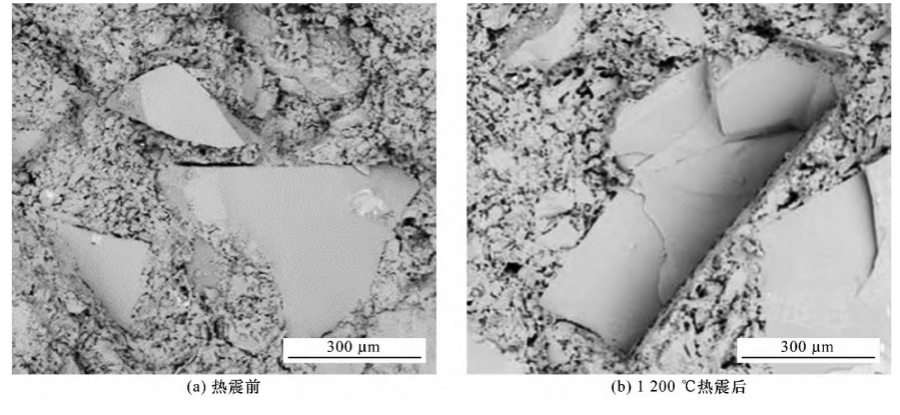 熱震前后試樣的斷裂韌性及保持率結(jié)果見(jiàn)表3。由表3可知,兩種試樣的斷裂韌性均隨熱震溫差的升高而降低,尤其是1600 ℃水冷后斷裂韌性保持率下降幅度明顯增大,此時(shí)真空振動(dòng)澆注試樣的斷裂韌性保持率有63.7%,而機(jī)壓試樣的斷裂韌性保持率僅為30.8%。此外,真空振動(dòng)澆注試樣斷裂韌性的數(shù)據(jù)分散性比機(jī)壓試樣的低,更有利于工程化生產(chǎn)時(shí)制品的品控。因此,真空振動(dòng)澆注試樣的抗熱震性?xún)?yōu)于機(jī)壓試樣的。